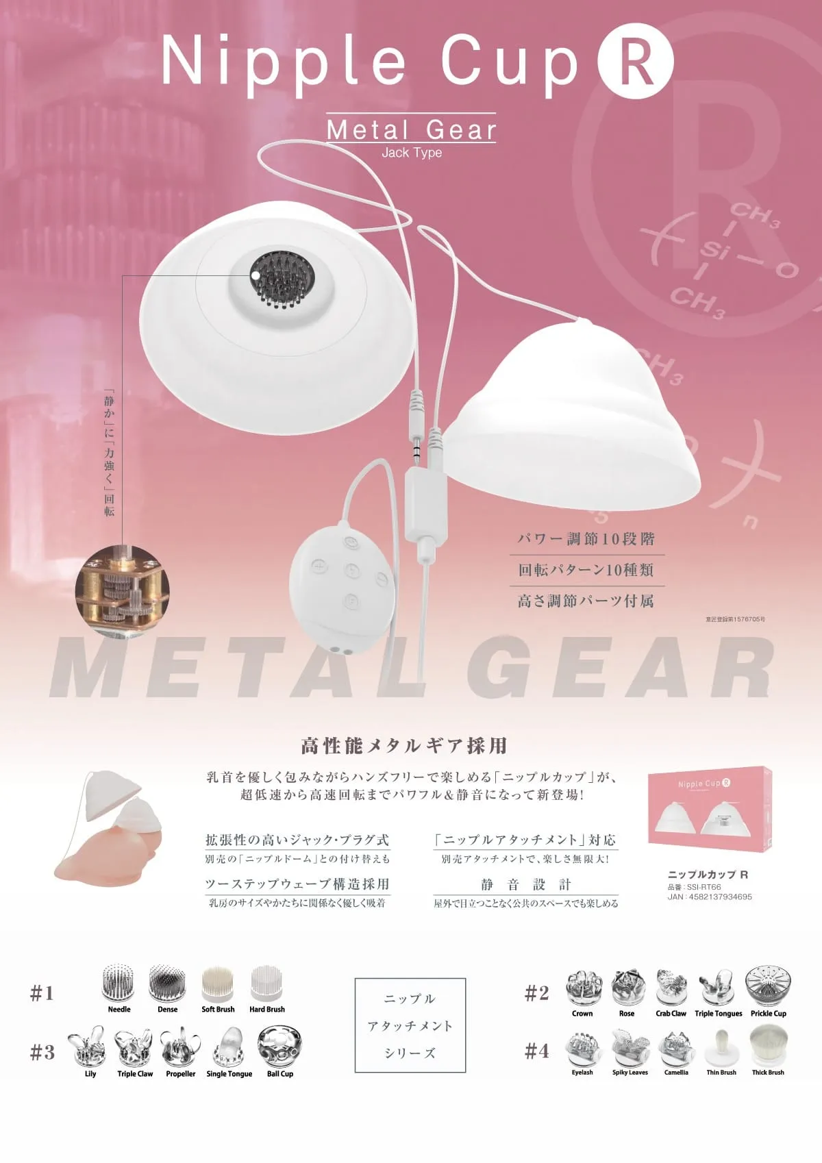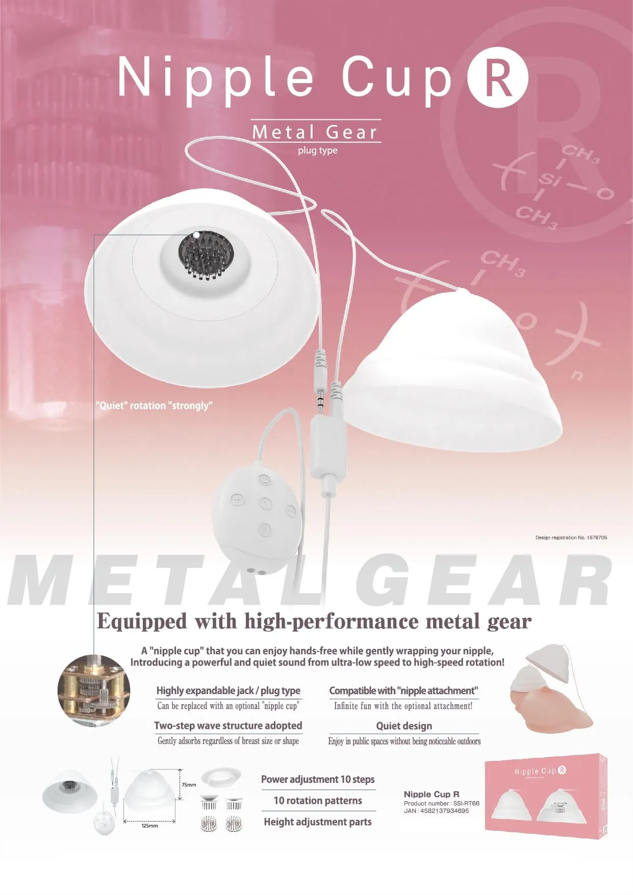 「金属齿轮」搭载!Nipple Cup 【R】登场! 改良的第二代更静音,更强劲的旋转不止!机能大幅上升! ① 旋转涡轮模式,随时提供最强最快的旋转刺激感。 ② 乳头杯与胸部皮肤之间连接部分为矽胶材料,男女适用,完美贴合所有胸形。 ③ 柔软的矽胶按摩配件全方位刺激乳晕,乳头与乳房。多种不同配件造型提供不一样的体验。 ④ 10级功率及10种选择模式,100种前戏调情组合,快慢任您在遥控器上调校。 ⑤ 再次升级加强了静音设计,穿戴在内衣内也能感受一把户外刺激体验。 受到各种媒体的报导和追捧的人気Nipple Cup ! 轻轻包裹乳房的曲线非常适合任何胸围,在男性和女性用家中都很受欢迎,实现更宁静更缓慢而且更强大的乳头刺激,刺激部件即使深深地压在乳头上,也不会阻碍转动。特别增强的静音设计更是令我们引以为傲,您可以在深夜享用亦完全不怕打扰他人。穿上了衣服,在户外或室内都不容被他人察觉,可以安心使用! 搭载10种旋转速度 x 10种旋转模式,共100种速度和模式的旋转组合让你每次使用都能保持新鲜感。另外,还有一个「Turbo Mode – 涡轮加速模式」,可随时提供最强和最快的旋转模式,一键将快感推至顶峰! 由于是插孔类型,因此电线不会缠绕在一起,非常便于充电和存放。另外还有数十种乳头附件可以替换(另售),每种都是截然不同的刺激感,替换一个附件感觉就是另一个新商品。 基于人体工学,多年研发优美的曲线(成波浪型)、2重波段设计,不论任何胸型都可以吸着,可以随意地装著的自然性设计,不分男女都可以使用!胸杯内部转动部份经过静音设计,转动头是磁力交替式,更换时更灵活方便!胸杯跟控制器使用了扩充性高的Jack PLUG,容易于管理及携带,日后有新功能或转用其他型号更为方便! 全部操作都是控制器上,10阶段速度调节,于不同时段提供不同快感,还提供 Turbo Mode 使快感绝对提升!付属品乳头跟接触头可上下调节(2阶段),任何胸型都可以照顾到~!产品都经过轻量化,搭载可回充的锂电池,只需使用付带的磁力USB线即可充电使用!胸杯的材料是使跟身体贴近的物料制造,不会构成过感或不适等问题。 我们非常推荐情侣在前戏时和活塞运动中佩戴使用,仅仅只需要通过遥控器操控瞬间就能增加超多情趣乐趣!产品还附带静音功能,所以您也可以和您的伴侣尝试体验一次户外玩耍。并且也非常适合一人独自使用,享受胸部按摩快感,探索开发自己的敏感区域! ■ 配件:乳头杯 x 2 件、控制器、用于充电的磁铁式 USB 电缆、高度调节部件(低)x 2 个、高度调节部件(高)x 2 个、高度调节环 x 2 个、乳头附件 x 2 个、使用说明书(日语) ■ 机身:杯子尺寸:H125 x W125 x D75mm 控制器:H60 × W45 × D23mm 重量:330g(杯子 x 2 + 控制器) ■ 包装:尺寸:H200 x W335 x D95mm 毛重:680g ■ 材料: 杯身部分:硅胶 ■ SKU:SSI-RT66 ■ EAN:4582137934695 附件:弹性体:食品分析测试[编号18020229001-0101] [Nipple Cup] 是 SSI JAPAN 的注册商标。 注册商标第5692934号 ※ 避免使用矽性润滑液,可以提高商品寿命,我们推廌同品牌的【乳头专用润滑液】,可以超持续湿润近60分钟并提升快感。
