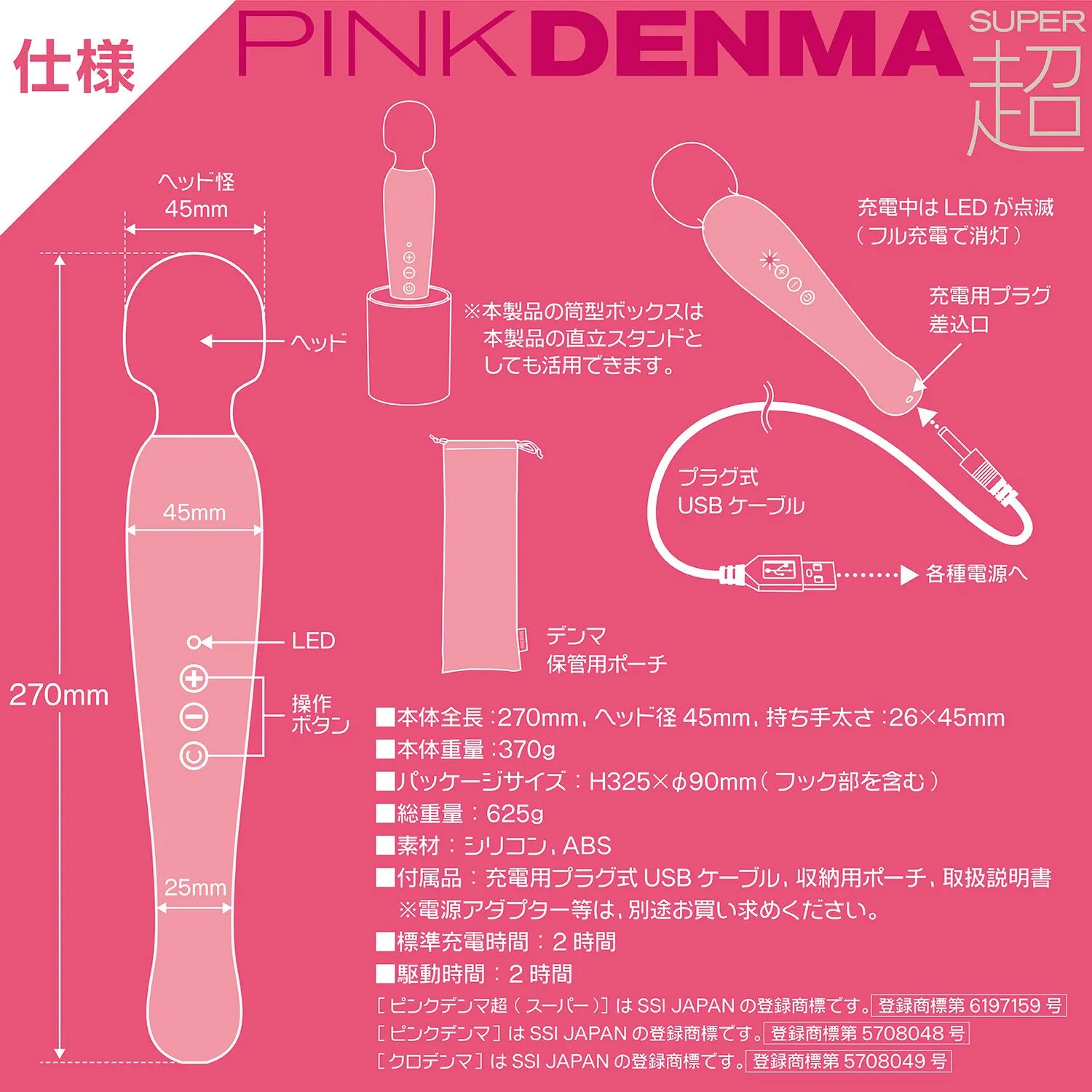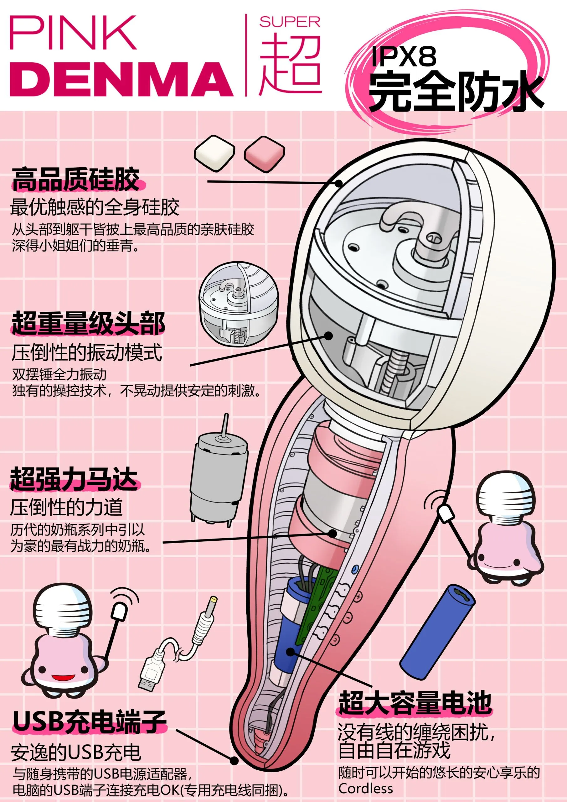 世界最强の日本奶瓶按摩棒Denma、推出最高杰作『粉 & 黑 Denma・超(SUPER)』全新包装现已上市! | 系列商品达到无人能及の累计销售量200万支/全日本 [信頼の日本制] 【超防水】完全防水(IPX8)机身100%! 清洗完全OK!用安全可靠的高级有机硅材料进行全面涂层! 【超振动】最优化内置motor机芯! 通过长期监测和反复试验,我们实现了既轻巧又兼具重量和安静感的振动,6阶段の强弱度x6种模式の快感振动! 【超静音】在宁静的深夜也有可靠の超静音! 为响应尽可能安静的要求,用最顶级的硅胶对内置电机进行全部涂层隔音! 超强振动x超静音x重型电机超防水(IPX8)!の『Pink Denma Super(Super)』应运而生,它值得Denma历史上最强的称号,超过了被称为最强和最好的「Absolutely Cool Denma」与「Pink Denma Plus」! 您不仅可以在水下使用它,例如浴室和游泳池,还可以在陆地,空中或任何地方使用它!在任何情况下都可以顺畅地开机而无压力,表现出最佳的性能! 此外,全面高品质的有机硅材料对您的身体安全有保障!轻柔地保护脆弱区域! -商品规格- 本体全长:270mm、杆头直径45mm、手柄厚度:26~45mm 本体重量:370g、包装尺寸:H325×φ90mm、总重量:625g 付属品:充电用插头式USB电缆、収纳袋、说明书 充电方式:插头式USB电缆、标准充电时间:2小时、使用时长:2小时 -注意事项- ※充电时间和使用时间因使用环境和使用条件而异。 ※为减轻电机负载,请勿持续使用20分钟以上。 ※确保使用附带的插头型USB电缆进行充电。 WILDONE JAPAN – PINK DENMA 潮极棒・超(SUPER) | 史上最高杰作