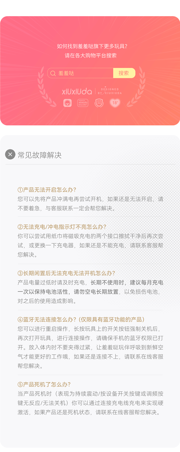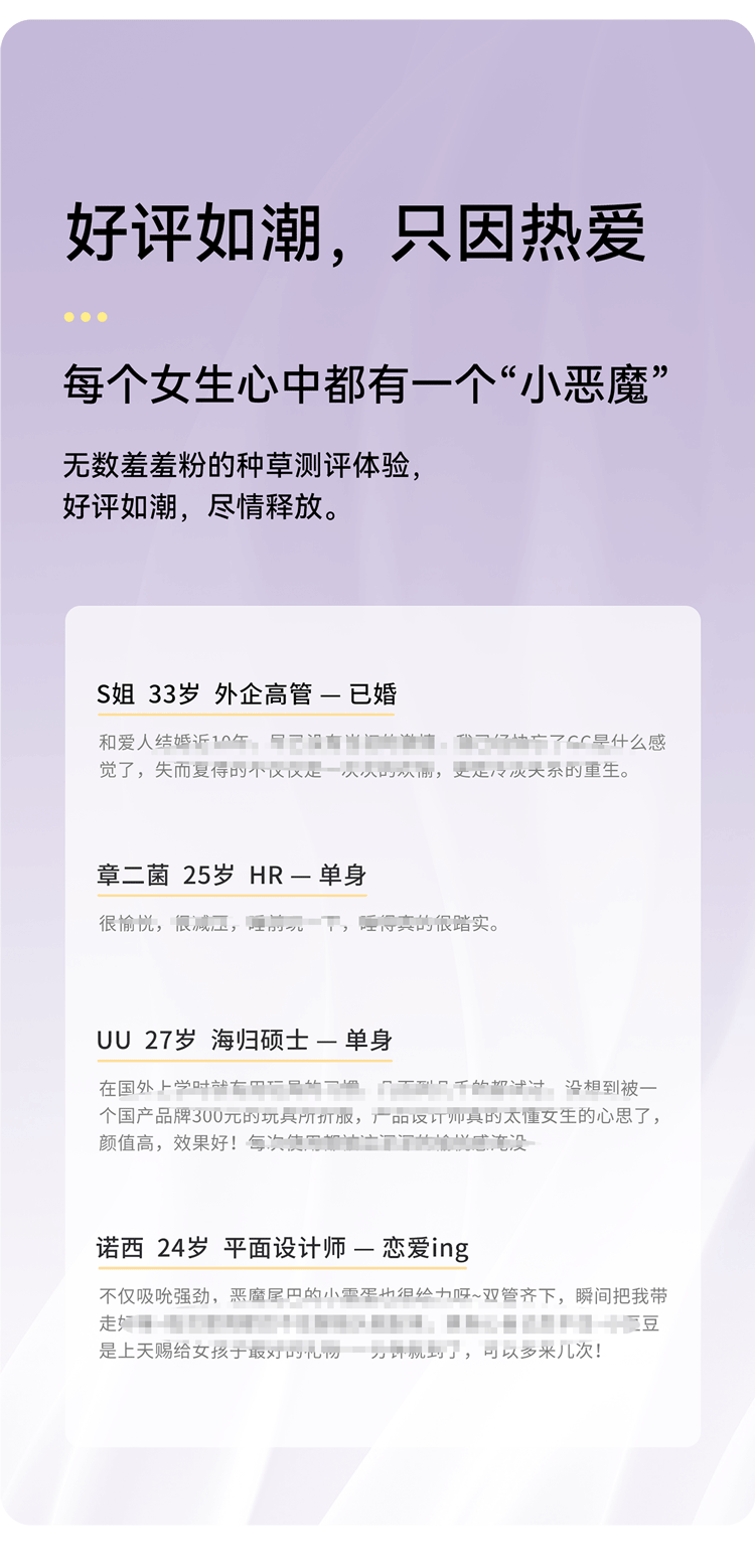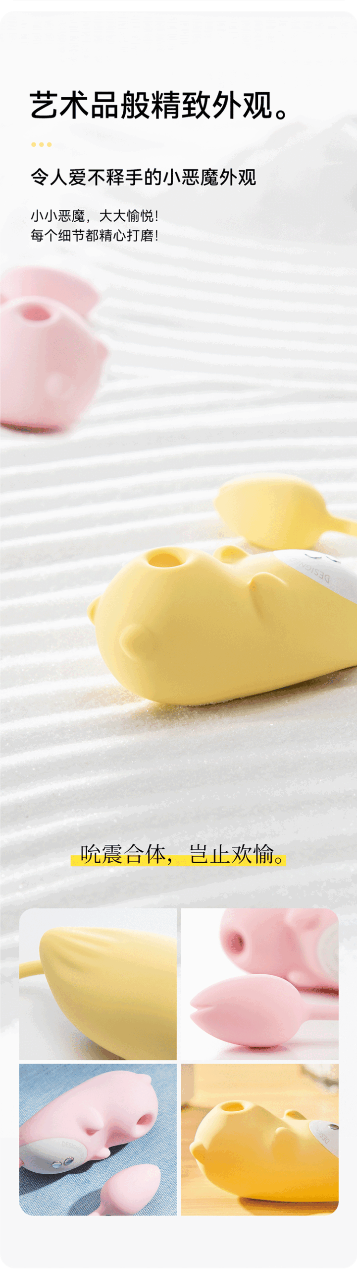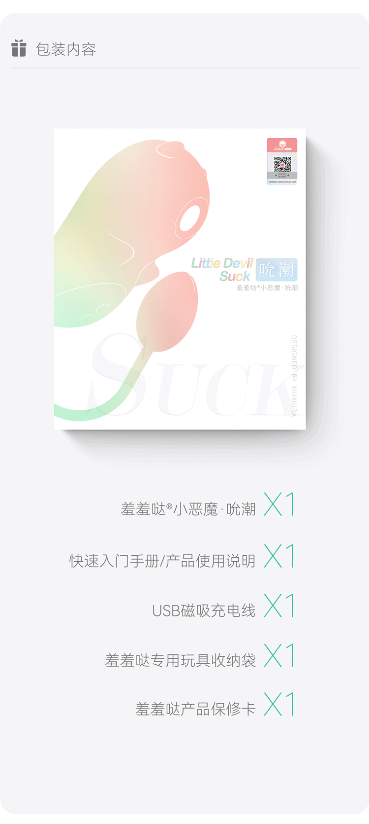 每个女生心中都有一只“小恶魔”,专注亚洲女性的美好情趣体验。 ① 声波吸吮+强力震蛋,外用+入体双重愉悦。 ② 软糯的矽胶包裹,外用亲肤,入体饱满。 ③ IPX7等级防水,不超过50分贝的噪音,安静而沉浸。 羞羞哒—年轻人的健康情趣生活,取悦自己,并不「羞羞」。原创设计,祝您冲破束缚,愈加勇敢!愿您「自信且从容」,「独立且自由」。 小恶魔系列;是羞羞哒旗下的子产品线,规划3个子系列,分别为:小恶魔震震蛋、小恶魔吮潮、小恶魔吮潮Pro,覆盖了从小白新手到老手玩家的所有人群。