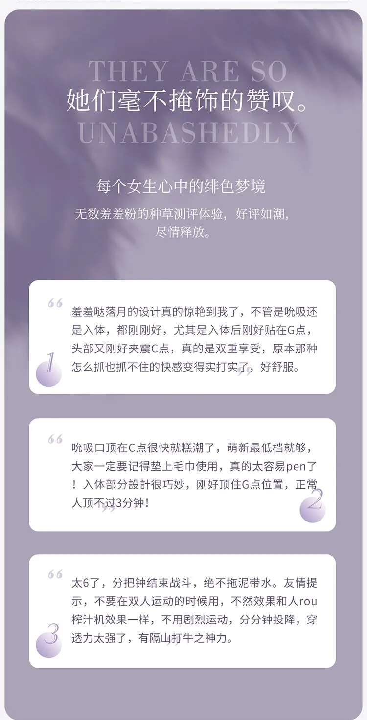 内外“同潮”,汹涌快意,专注亚洲女性的美好情趣体验。 ① 声波吮吸C点,棒身震颤G点,双重愉悦。 ② 10种吮吸震动模式,同时开启多种玩法。 ③ 软糯舒适硅胶包裹棒身,棒身智能恒温可加热。 ④ 低噪音,IPX7等级防水,磁吸充电。 羞羞哒—年轻人的健康情趣生活,取悦自己,并不「羞羞」。原创设计,祝您冲破束缚,愈加勇敢!愿您「自信且从容」,「独立且自由」。 落月 Faling Moon系列;是羞羞哒旗下又一力作,发售后广受好评,分别提供「珊瑚粉」,「木槿紫」2种颜色供您挑选。产品拥有吸吮、强振、加温、防水等功能,可同时按摩刺激女性内外两个敏感点,包括10种吮吸震动玩法,IPX7等级完全防水您可以放心冲洗,尽情玩乐!