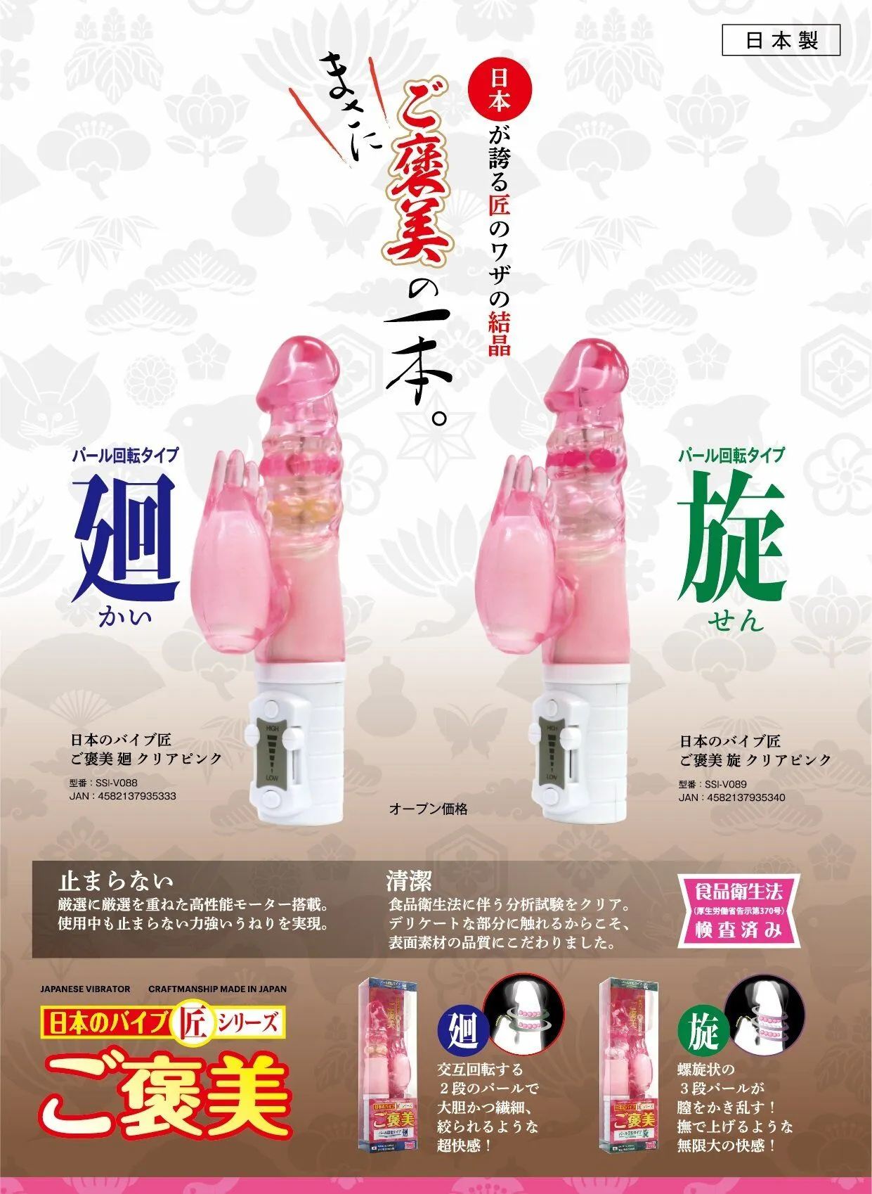 日本エロチズムの集大成バイブ!别方向に廻る2段のパールリングが内侧をうねうねコスり、クリバイブがすっぽり包み込む! 集日本成人玩具工业大成!朝著相反方向旋转的两层珍珠环在内部此起彼伏地环绕与膨胀! ●两层珍珠反向交替旋转,挤压出即动感且细腻的超级快感!| 日本制造同时让产品呈现四种最高等级 [Made in Japan] 【品控の匠】 最高的安全性和性能!在日本食品研究实验室进行了有害物质检查。所有明确的严格标准值! 它被认为是食品级安全弹性体。 而且,组装负责人是具有40年振动棒生产经验的资深人士。 【材料の匠】 使用通过全面检测的,拥有“滑溜溜”质感的纯正肌肤质地材料! 它没有气味,也不粘,因为它是日本国内生产的最高质量的产品! 它改善了柔软性与弹性之间的平衡,并像喜欢的恋人一样适合女性。 【设计の匠】 通过人体工程学不断研究分析各种女性形态各异的阴道结构,G-Spot和阴蒂位置而诞生的CLEAR PINK,已经成为通晓女性生理结构的振动棒。插入后的贴合感与双向转珠的全新体验外加「天使之翼」的设计绝对让您满足感爆表! 【工艺の匠】 配备4节AAA碱性电池和4个强大的6V大功率,即使您全都投入使用,它也能保持运转! 改进的2020年型号,配备最新零件,修订的电机和齿轮! 工匠精神打造的舒适感――给女性愉悦的感觉。 在昭和天才工匠的全力配合下,从龟头,阴茎肌肉甚至到包皮上浮起的青筋纹路,完全还原了真实的男性的阴茎! 由赢得国际设计大奖的设计师精心制作的宝石,从产品的造型到手工制作,甚至对珍珠的排列和数量都进行了全面考虑。 最高品质日本制造的振动器,最大程度地提高了愉悦感。 不仅龟头,而且两层的珍珠圈也沿不同方向强有力地排列在一起。 从珍珠的排列,位置和数量都是经过精密考量和无数次的试验后诞生的最佳组合! 清澈的粉红色和金色的组合让人联想到奢侈品牌,营造出奇妙的愉悦时光。 它创造了一个新奇的乐趣,只需按一下按钮即可反转! 拥有八枚羽翼的环绕包裹著阴蒂,使您从轻柔抚摸到强烈刺激都游刃有余! 犹如剑一样强大的线条,只需插入即可刺激G点。 机身尺寸:总长220 x宽40 x深80毫米 插入直径:最大38毫米 重量:215g(不含电池) 包装尺寸:H260×W80×D48mm 总重量:315g 附件:AAA锰电池x 4(用于运行测试) 《日本食品卫生法》 [厚生劳动省公告第370号]