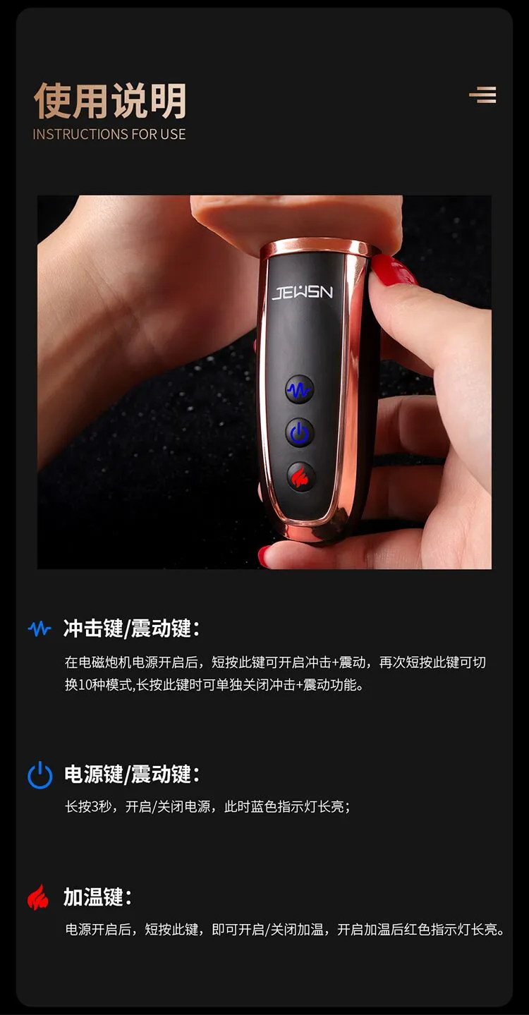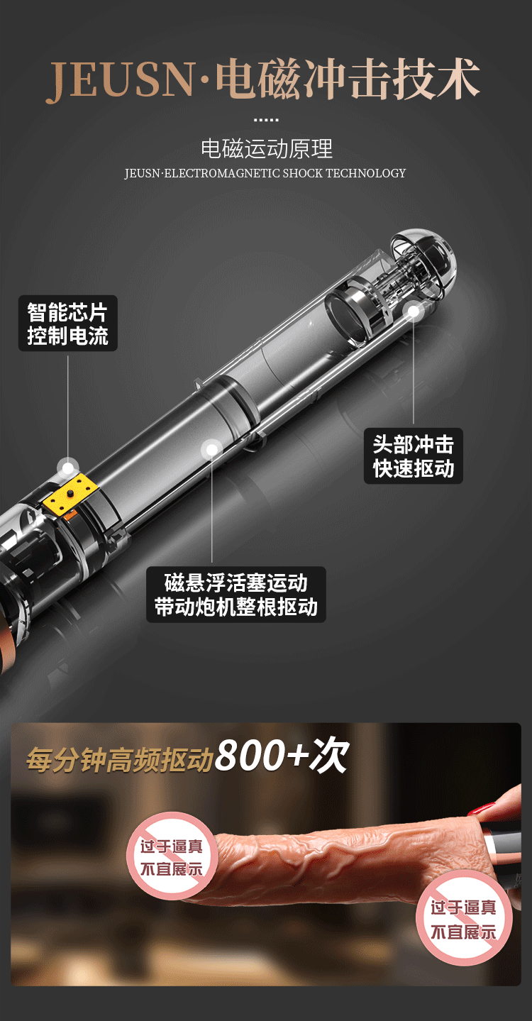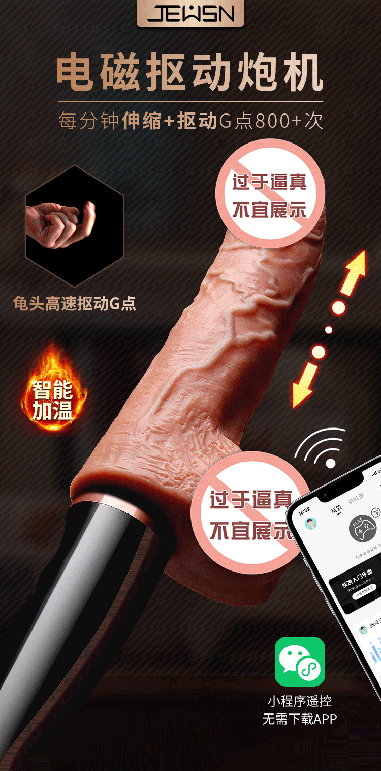 更好的进口材质、更舒适、更柔软!比女人更懂女人的阳具! ① 每分钟800+次的全自动高速伸缩扣动G点! ② 欧美猛男上翘龟头款式,亚洲尺寸刚刚好! ③ 柔软肉感,仿真龟头,粗筋满满,触感舒适! ④ 智能加温,电磁运动时转换动能为热能! ⑤ 手机关联,异地控制,操作简单,功能丰富! ⑥ 小巧外形,方便储藏,可随身携带于包包中! ⑦ USB磁吸充电,比传统针式充电口更耐用! JEUSN [久兴] — 懂您的两性原创情趣生活品牌,「JEUSN 阳具」系列全面登场本店!现今隆重推出名气产品「 粗筋满满一体式手持自动电磁炮机」,欢迎您的选购。与一般仿真阳具不同,使用本产品具有10频伸缩扣动、酥麻强震、智能加温、手机互联等多重刺激。最先进电磁冲击技术带来超强快感动力:智能芯片控制电流稳定输入;头部冲击快速扣动动力强劲;机身内部磁悬浮活塞运动带动炮机整根扣动,高达每分钟800+次的高频扣动快感绝伦!特意为需求快速扣动的女性而设计的上翘龟头,模拟欧美猛男阳具的天赋角度,配上不大不小的亚洲男性尺寸,利用龟头高速扣动,像岛国金手指一样快速扣动G点!采用进口材料,全身柔软肉感,即使扣动再快,也不会感到生硬,体验舒适感MAX!自研小程序一键分享异地控制,流畅不卡还可保存自创频率。操作简单功能丰富,甚至可以同时进行语音或视频。配有智能运动加温功能,能靠电磁运动,在运动中把动能转换为热能,使得炮机大面积加温,从上温暖到下!虽然本品冲击力强,但是采用低噪音私密设计,让您在寂寞深夜使用时在房间外也听不到。相对于传统炮机,本品外形小巧,轻松储藏于床头柜,更可放入包包中出差旅游随时使用玩乐。使用后容易清洗生活防水,可直接在水龙头下冲洗。USB 磁吸充电,比传统针式充电口更耐用。 ■ 包装尺寸(mm):H285 × W100 × D67