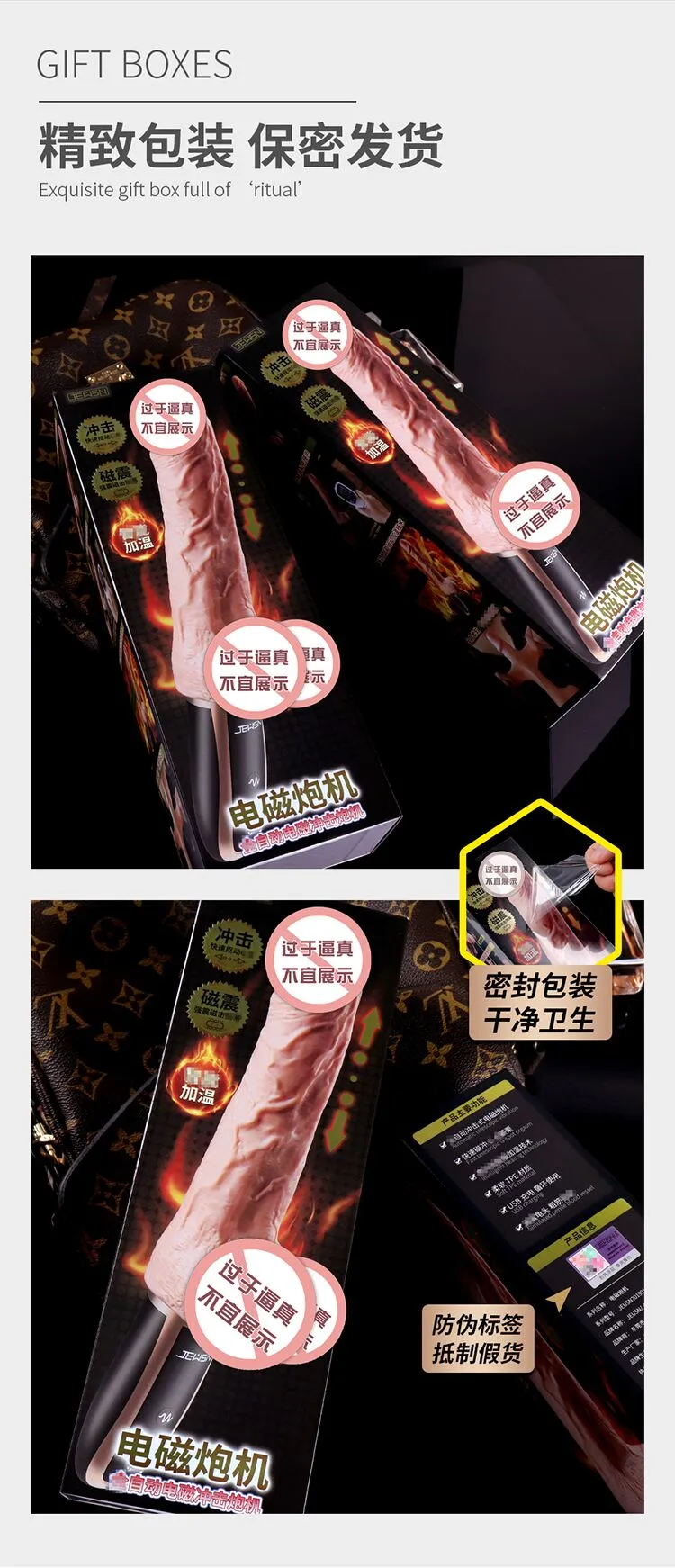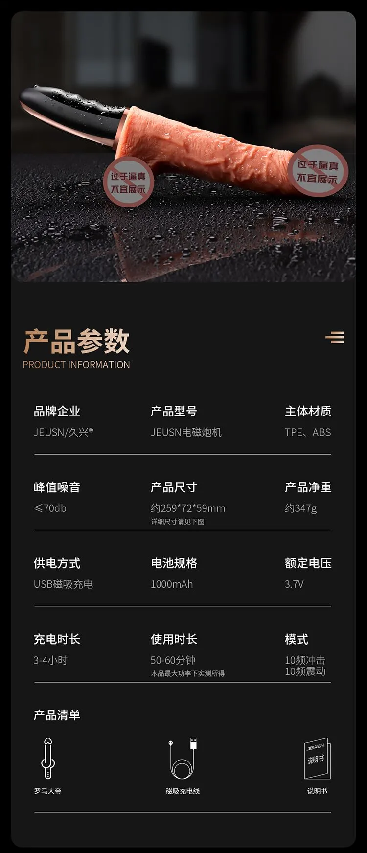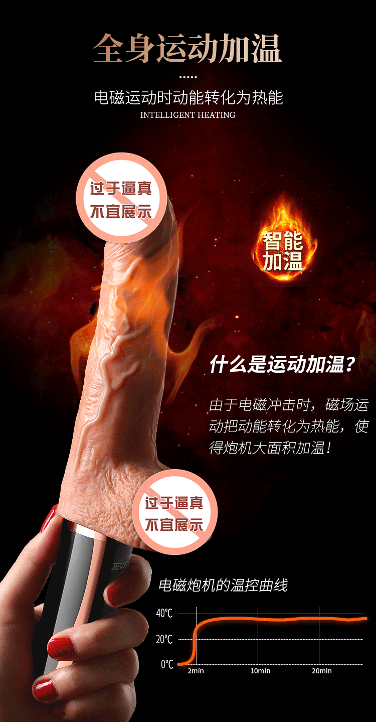 更好的进口材质、更舒适、更柔软!比女人更懂女人的阳具! ① 每分钟800+次的全自动高速伸缩扣动G点! ② 欧美猛男上翘龟头款式,亚洲尺寸刚刚好! ③ 柔软肉感,仿真龟头,粗筋满满,触感舒适! ④ 智能加温,电磁运动时转换动能为热能! ⑤ 手机关联,异地控制,操作简单,功能丰富! ⑥ 小巧外形,方便储藏,可随身携带于包包中! ⑦ USB磁吸充电,比传统针式充电口更耐用! JEUSN [久兴] — 懂您的两性原创情趣生活品牌,「JEUSN 阳具」系列全面登场本店!现今隆重推出名气产品「 粗筋满满一体式手持自动电磁炮机」,欢迎您的选购。与一般仿真阳具不同,使用本产品具有10频伸缩扣动、酥麻强震、智能加温、手机互联等多重刺激。最先进电磁冲击技术带来超强快感动力:智能芯片控制电流稳定输入;头部冲击快速扣动动力强劲;机身内部磁悬浮活塞运动带动炮机整根扣动,高达每分钟800+次的高频扣动快感绝伦!特意为需求快速扣动的女性而设计的上翘龟头,模拟欧美猛男阳具的天赋角度,配上不大不小的亚洲男性尺寸,利用龟头高速扣动,像岛国金手指一样快速扣动G点!采用进口材料,全身柔软肉感,即使扣动再快,也不会感到生硬,体验舒适感MAX!自研小程序一键分享异地控制,流畅不卡还可保存自创频率。操作简单功能丰富,甚至可以同时进行语音或视频。配有智能运动加温功能,能靠电磁运动,在运动中把动能转换为热能,使得炮机大面积加温,从上温暖到下!虽然本品冲击力强,但是采用低噪音私密设计,让您在寂寞深夜使用时在房间外也听不到。相对于传统炮机,本品外形小巧,轻松储藏于床头柜,更可放入包包中出差旅游随时使用玩乐。使用后容易清洗生活防水,可直接在水龙头下冲洗。USB 磁吸充电,比传统针式充电口更耐用。 ■ 包装尺寸(mm):H285 × W100 × D67