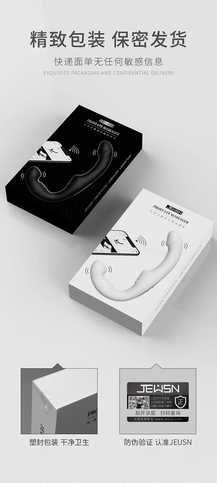 男人也需要好好关爱前列腺,来解锁男人的G点吧! ① 10个按摩模式助您舒服按摩,轻松享受前列腺SPA! ② 超强动力双震动马达,震感深入前列! ③ 手机小程式互联,异地遥控,可自己或玩双人玩! ④ 食品级液态矽胶制造,欧盟CE与RoHS认证,放心使用! ⑤ 双头智能加温,恒温温暖前列腺! JEUSN[久兴] — 懂您的两性原创情趣生活品牌,「JEUSN 阳具」系列全面登场本店!现今隆重推出名气产品「 JEUSN – 双头酥麻强震精准前列腺会阴按摩器 雅黑[智能加温+支持APP]」,欢迎您的选购。本品具有10个动力频率可选之余还带双头智能加温与可DIY专属您的震动频率,无线遥控与高质仿真材料,一键分享控制权给异地伴侣,语音/视频同时互动,仿佛TA在身边帮您按摩!人体工学设计,助您精准找到前列腺位置,插进后就能覆盖前列腺中心点,紧贴持续按摩前列腺,每周在家按摩2-3次,放松您的前列腺(又称男人G点)。安静使用不到50分贝不打扰您的按摩体验。 ■ 包装尺寸(mm):H210 × W12.5 × D40