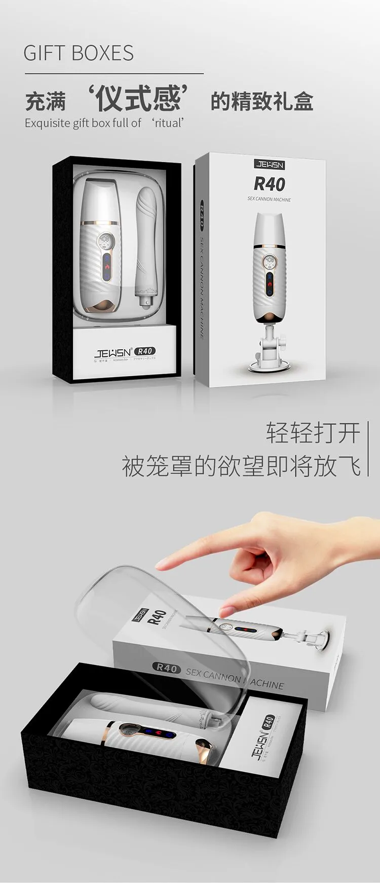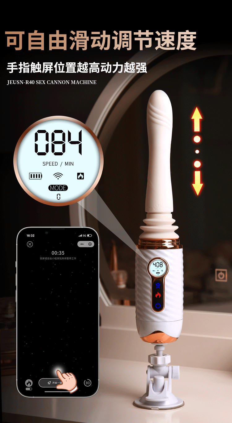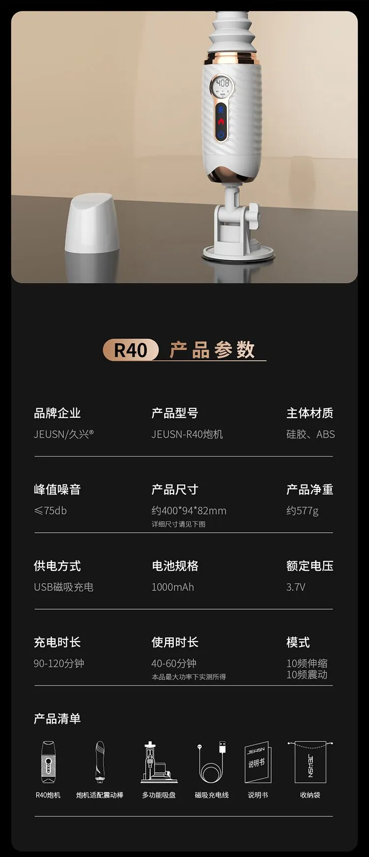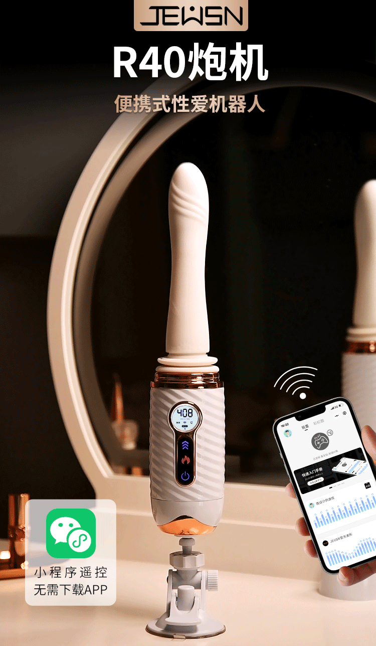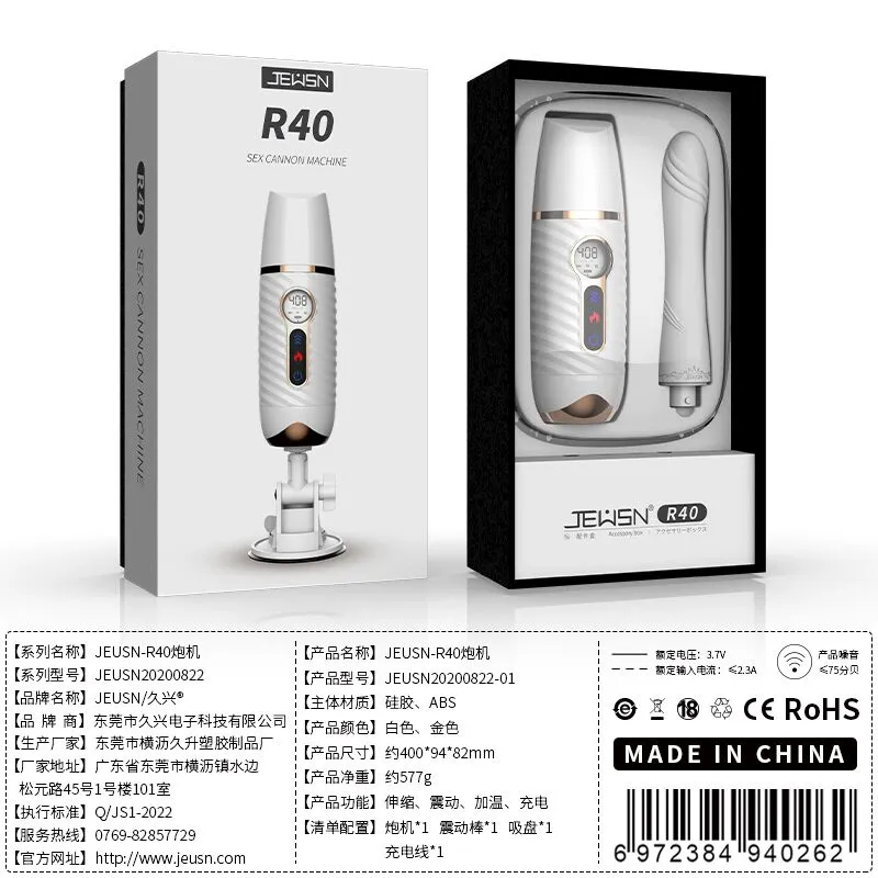 更好的进口材质、更舒适、更柔软!比女人更懂女人的阳具! ① 每分钟408次的全自动高速伸缩刺激G点! ② 动力引擎强劲入体后不卡机,震感穿透! ③ 高科技感液晶显示,功能信息一目了然! ④ 自动恒温,智能温热模拟暖男身体温度! ⑤ 手机关联,异地控制,操作简单,功能丰富! ⑥ 手指触屏滑动调节速度,10频酥麻任意调节! ⑦ 多角度免提吸盘,满足前后左右各个姿势角度! JEUSN [久兴] — 懂您的两性原创情趣生活品牌,「JEUSN 阳具」系列全面登场本店!现今隆重推出名气产品「 R40 无线遥控便携式性爱炮机」,欢迎您的选购。最新升级后的便携式性爱机器人 – R40 炮机动力比肩传统大型炮机,具有10个动力频率可选,每分钟可高达408次的伸缩抽查。先进的动力引擎提供持续稳定的动力输出不会卡机,不必担心进入体内后动力会变小。升级后的震感模组能深层穿透神经引动G点高潮。自研微信小程序无需下载,支持手机互联分享控制,自己玩、双人玩多种玩法任您选择。异地控制,流畅不卡,可以同时进行语音或视频,互动更有趣,异地感情升温,彷佛就在他/她身边!官方精选10种酥麻频率可随意切换,小程序中可自由滑动快速切换调节速度,操作简单,功能丰富。科技感十足的液晶显示能清晰展示当前频率、速度、电量、加温。采用进口材料,柔软硅胶触感,不撑大无异物感。配有智能温热功能,模拟暖男身体温度自动恒温。底部吸盘吸力超强,锁上吸附键后能牢牢吸住,可在床头、桌子上和浴室墙上随便吸,发挥创意哪里都可以是战场!吸盘多角度可调前后左右各个姿势都能满足。虽然本品冲击力强,但是采用低噪音私密设计,相对于传统炮机更加的低噪,让您在寂寞深夜使用时在房间外也听不到。本品附赠收纳袋,轻松私密匿藏保持卫生,更可放入包包中出差旅游随时使用玩乐。使用后容易清洗生活防水,可在水龙头下冲洗。USB 磁吸充电,比传统针式充电口更耐用。 ■ 包装尺寸(mm):H320 × W180 × D90