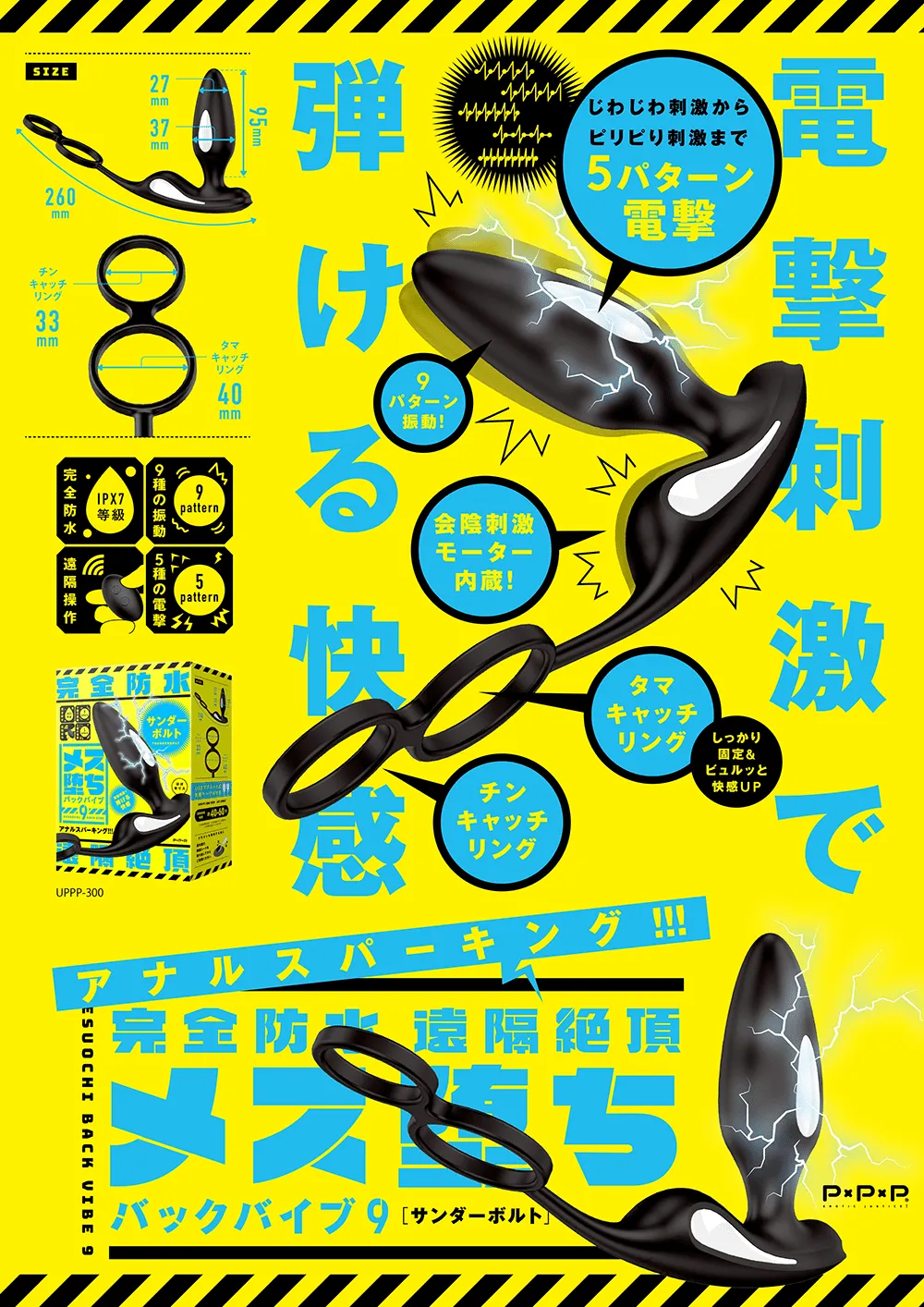 一款强行让您坠入女性化的超强后庭振动棒!像女生一样高潮,爽到短路! ① 9种振动模式搭配5种脉冲电感模式刺激多样! ② 维持勃起的鸟环和提升射精感的单环双环设计! ③ 遥控操作,方便容易,自己玩一起玩随心所欲! ④ IPX7 等级完全防水,可以水洗更容易清洁! ⑤ 日本产原装进口质量保证,可放心使用! 大厂P×P×P誓要电击冲击,快感炸裂您的后庭!色色情趣用品商城现今隆重推出完全防水系列产品「 P×P×P 完全防水 – 遥控极限 雌堕后庭振动棒9 雷霆霹雳」,欢迎您的选购!这一款利用电击来刺激后庭的后庭振动棒,共5种脉冲电击模式,从微刺激的舒适快感到后庭哆嗦一震快感的电击!做好被新快感的电击强行让您坠入女性化的觉悟吧!内有会阴刺激的马达,双重快感!多达9种震动模式再加上维持勃起的鸟环,阿嘶~射精感满满的蛋环,让您爽到脑袋短路!!!像女生一样高潮,让您彻底坠入成为女性的优秀振动棒!请您多多摸索更多的玩法,寻找更多的新快感喔!发挥您的创意,配合 「久兴 缓痛舒适型后庭润滑油」,马上开启一场有情有趣的真正游戏吧! ■ 包装尺寸(mm):H168 × W120 × D60