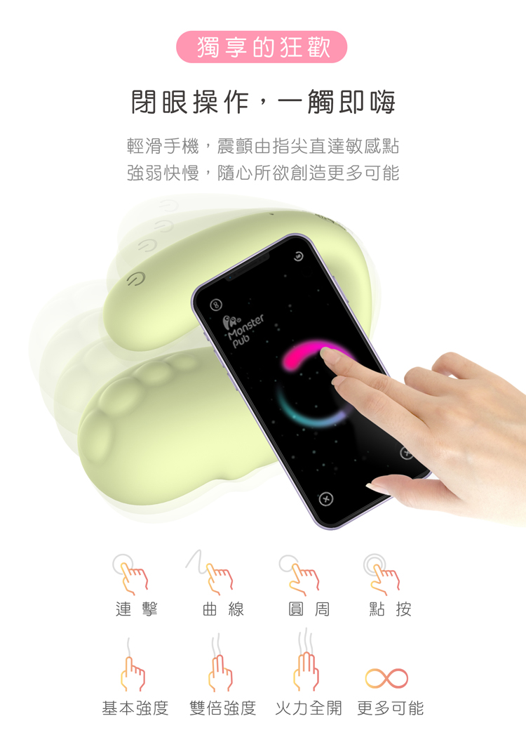 超萌恶魔先生圆润温和看似无害,但恶魔的犄角将深入袭击您的神秘高潮地带,带来前所未有的惊奇体验! ① 超时空恋爱神器,无限创造波形震颤共享,App 智能遥控,U型全面贴合-GC内外双重刺激! ② 手机暴走玩-摇动、翻转手机触发惊喜刺激;智能加温:令人放松、敏感加倍,享受源源不绝的愉悦! ③ 单机备 8 大精致震动模式,情感灯光-怪兽之心只为您跳动! ④ 丝滑亲肤矽胶,柔软Q弹绝佳触感IP67防水防尘好清洗! 异地恋? 旅游? 有小怪兽2代,距离不是个问题!即使足不出户,依然可以邀请远在他乡的他为您带来一次次震撼人心的触动,让异地的心跳频率不谋而合。 风靡日、韩、台,在台湾大卖过百万台的小怪兽2代一共有3种款式,而小怪兽2代恶魔先生 主攻阴道+A点。特设恶魔般的棱角,不但能重点按摩A点,更可强力震动摩擦阴道,袭击您的神秘高潮地带。(A点在哪里?据说G点的位置就在两指节向上弯曲处,而A点则要往更深处找,大约距离阴道口7-15公分深,每个人不太一样。但无论如何,恶魔先生都会找到您的A点,令您体验前所未有的高潮快感。)人气推荐的小怪兽2代 一共有3种款式,分别是鲸鱼博士 、恶魔先生与哥斯拉大师,每种款式都有健康版与青春版两种不同版本。小怪兽2代机身头尾各有一个强力摩打,加上8种预设震频,为您带来 360 度的双摩打环绕立体震动;再配合改良的全面U 型设计,更准确地贴合及刺激您的 G 点与阴蒂,带来内外夹攻、具有层次的立体双重高潮,让您体验人类做爱史上前所未有的特殊快感! 搭配小怪兽 2代专属APP,3种玩法模式,等您尽情发掘无限可能! 小怪兽 2代的APP介面简单易用,连接后提供以下3种模式。另外,您更可以选择别人的波形,感受其他女生们的频率,并选择您想尝试的项目,与另一位贴心闺蜜同步共感,所有过程全部静音,带给您最舒适的安全感。 独自愉悦:尽情地以手指在萤幕上自由滑动,从一指到四指滑动带来的震动强度不一样 (一指最弱、五指最强、不同手势用法),用您最喜欢的频率来取悦自己,另外翻转手机时还会有意想不到的强震喔! 远程遥控:可透过WhatsApp,LINE,Kakao Talk,Wechat等即时通讯应用程式,邀请远在他乡的他为您带来每一次的触动,让异地的心跳频率不谋而合。 暴走模式:感测到您的任何一个身体动作变化,即使是一个小小的翻身,小怪兽都可即时捕捉并给您惊喜的回应! 凯格尔运动是一种非常有效的锻炼方式,而小怪兽2代健康版是这项运动的理想帮手。这款产品搭载了微压传感器、温度传感器和专属的APP,可以成为您的私人教练。它可以感应阴道肌肉的紧致度,并且通过即时的数据显示训练成果。透过科学化的数据纪录,可以提供更准确的训练体验和更有效的训练效果。 ■ 包装尺寸(mm):H140 × W140 × D85
