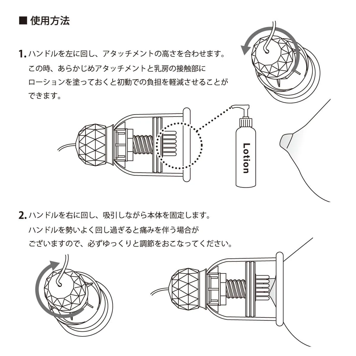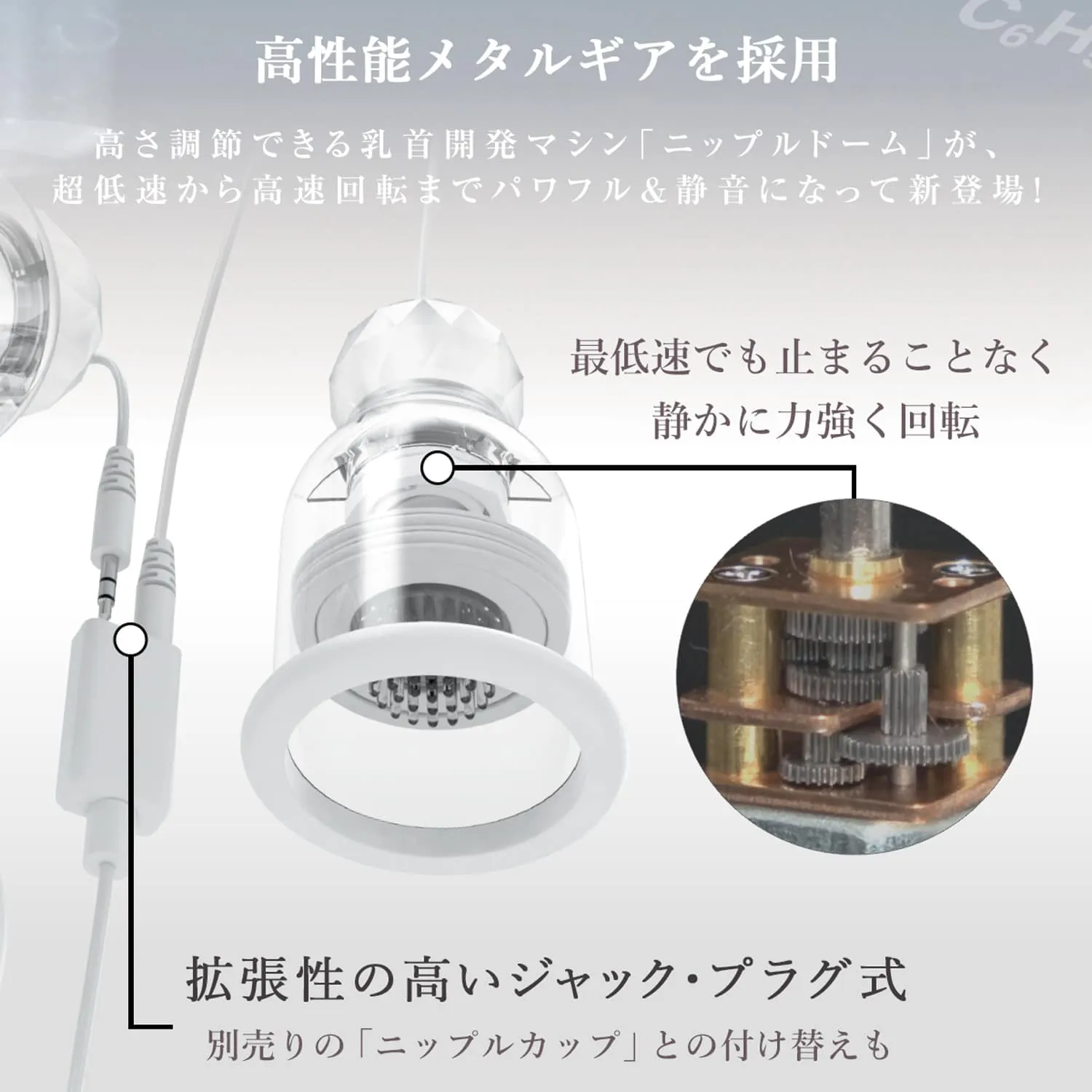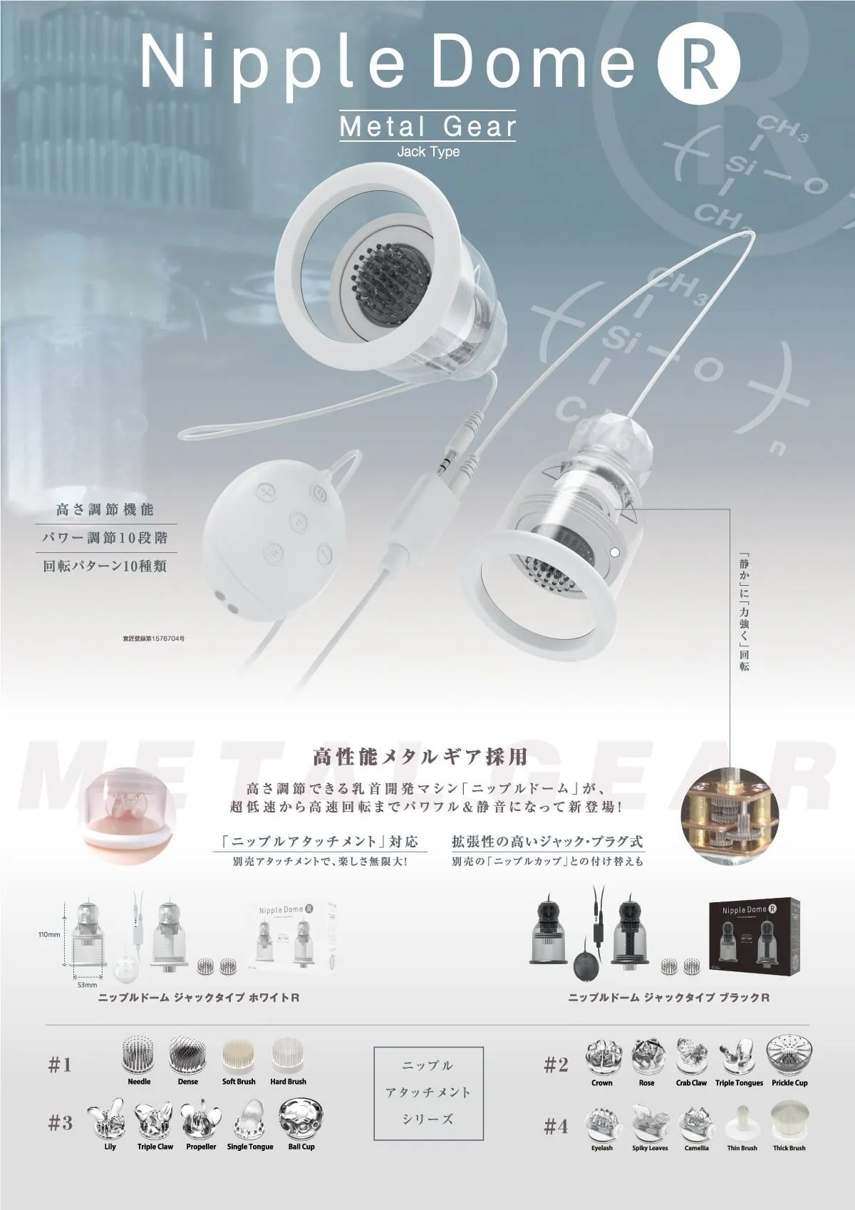 「金属齿轮」搭载!旋转乳头罩【R】登场!二代机能大幅上升,更安静,更缓慢,更强劲的旋转快感不断! 自从电视和互联网上登场以来,人気爆発的旋转乳头罩获得各男女用家大好评,市埸上乳首开発的最佳玩具之一! 【Nipple Dome R】二代将旋转功能进化,可实现更慢速和更强劲的旋转,刺激部件即使深深地压在乳头上,也不会阻碍转动。除了吸附在胸部的真空感觉外,更带来由乳头蔓延至全身的从未体验快感!人気的手柄式顶部更易于调节高度,适合不同尺寸的用家使用。 通过配备锂电池的轻巧控制器,可调节10种旋转速度 × 10种旋转模式。另外,还有一个「Turbo Mode」,可随时提供最强和最快的旋转模式,一键将快感推至顶峰! 由于是插孔类型,因此电线不会缠绕在一起,非常便于充电和存放。还有额外数十种乳头附件可以替换(另售),每种都是截然不同的刺激感,替换一个附件后的感觉就像又使用了另一个新的商品。 避免使用矽性润滑液,可以提高商品寿命,我们推廌同品牌的【乳头专用润滑液】,可以超持续湿润近60分钟并提升快感。另外还可以配合「Nipple Dome Harness Lux 乳头拘束带」,即使任何体位或大动作移动仍然保持牢固! 我们非常推荐情侣在前戏时和活塞运动中佩戴使用,仅仅只需要通过遥控器操控瞬间就能增加超多情趣乐趣!产品还附带静音功能,所以您也可以和您的伴侣尝试体验一次户外玩耍。并且也非常适合一人独自使用,享受胸部按摩快感,探索开发自己的敏感区域! ■ 附件:乳头罩 x 2 件、控制器、用于充电的磁铁式 USB 电缆、附件类型 #1 x 2 件、使用说明书 ■ 商品:尺寸:H112 x W68 x D68mm 控制器:H60 × W45 × D23mm 重量:283g ■ 包装:尺寸:H180 x W245 x D90mm 毛重:449g ■ 材料:皮肤接触贴环:矽胶材质 附件:弹性体食品分析测试【编号18020229001-0101】※ 充电时间:约150分/连続使用时间:约90分
