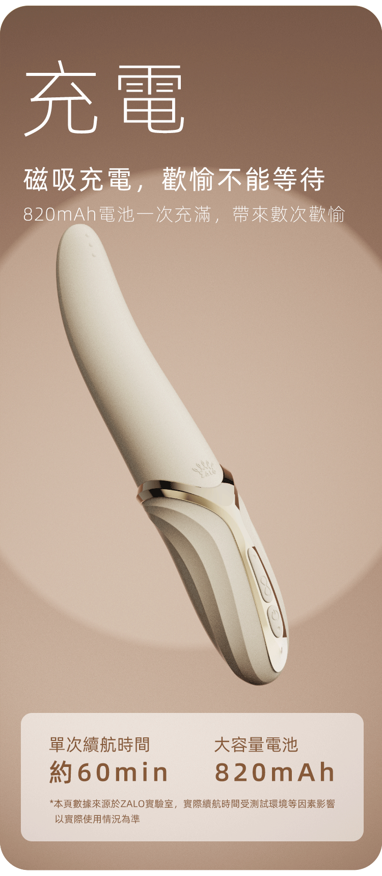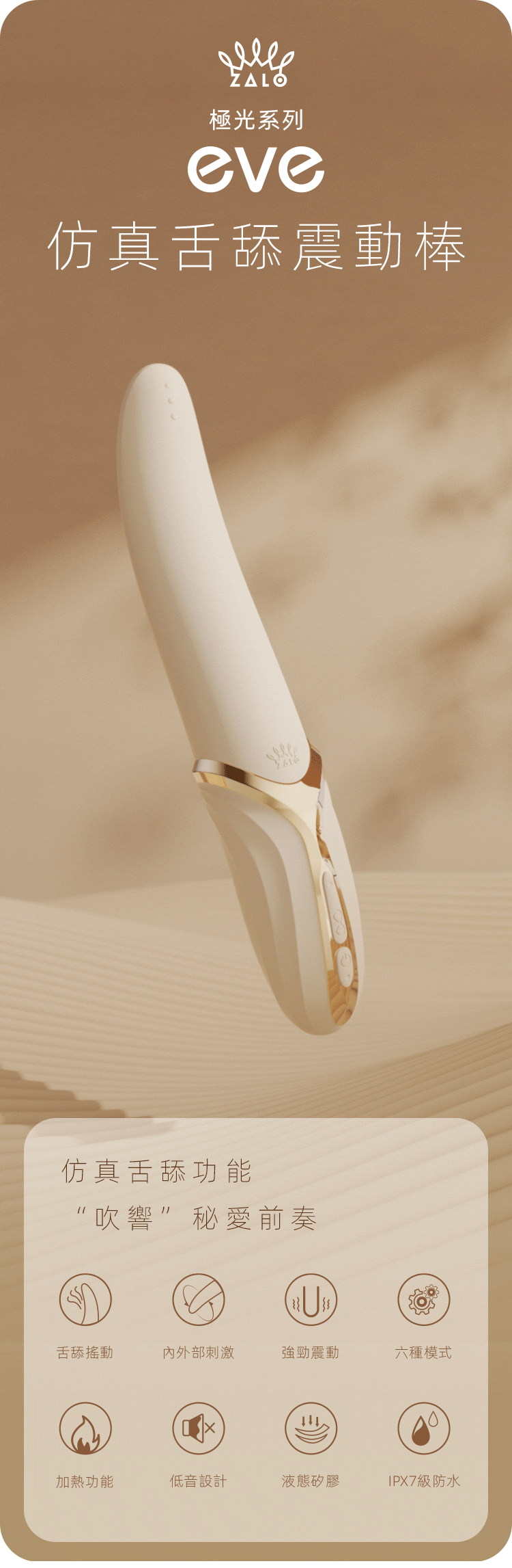 犹如真人般的舌舔快感,摇摆及震动双马达深层引爆高潮,让每寸肌肤都颤栗! ① 强劲搅动,每分钟900转的高速与360度全方位舔舐范围,多种频率随意调节,舒适愉悦。 ② 灵魂震颤,每分钟800转的钨钢马达带来全新震动体验,让您释放内心的激情和渴望。 ③ 舒适呵护,采用安全液态硅胶,出色的柔软性、弹性带来完美触感,符合严格卫生标准。 ④ 恒温加热,独立恒温辅助,棒身表层可升温至38度,爱的温感由我给您。 ⑤ IPX7防水,让您在私密时刻轻松清洗,满足您无论是沐浴还是享受水中乐趣的全面需求。 只有我们,还是您也注意到玩具不是很……漂亮?ZALO是一华丽的高端成人产品系列,每件产品都具有引人注目的美感。 每一件产品都是一场视觉盛宴,就像您的其他感官一样。致力于打造最高端豪华的成人玩具,ZALO 给您最美丽的那个她诚意献上精心设计打造 「ZALO – 极光系列 EVE 仿真摇摆舌舔加热充电震动棒 象牙白」。 极光系列的设计灵感源于时代的脉动,追逐潮流的年轻时尚女性是其主要受众。每个产品都以精致的外观和独特的风格吸引著目光,为年轻女性带来前所未有的体验。 EVE搭配食品级液态硅胶最大程度上逼近柔软的舌头,并且液态硅胶内部设计了两款马达,一款摇摆舌舔马达在中部另一款震动马达在舌尖处,这样可以在享受摇摆舌舔的同时体验舌尖震动的刺激。 这款舌舔振动棒不仅可以入体使用,还可以体外刺激C点舔震同时进攻,拥有双重享受,另外 EVE 还配备了加热功能模拟人体舌头温度,采用磁吸式充电防水等级可达7级,使用完后可以放心冲洗干净。 ■ 包装尺寸(mm):H260 × W90 × D65