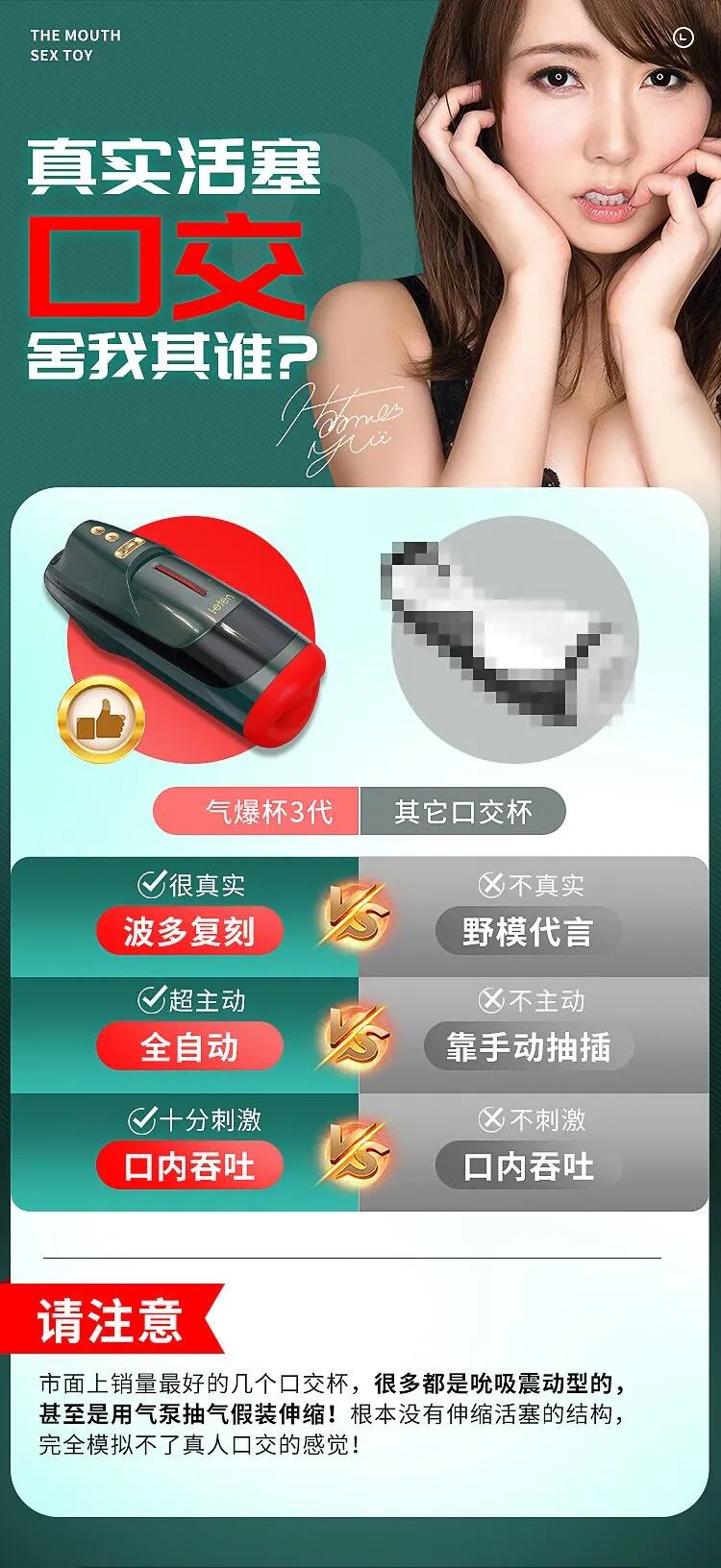 最新款全自动活塞口爆飞机杯,三大升级,快感狂飙,吞吞吐吐激情全开! ① 每分钟300次全自动口,女优级口爱! ② 全程口内包裹活塞吞吐,快感无损! ③ 无级调速,精准定位,口速快感可视化! ④ 多达7种口爱频率,玩法多多等您解锁! ⑤ 特制记忆软胶如女优亲吻,肉感如真人! ⑥ 可预先智能加热,比真人更暖更爽快! ⑦ 配有香薰盒,女优体香令您感官全开! 女优之王波多野结衣亲自代言,「雷霆暴风 – 波多野结衣全自动气爆口交杯 第三代 | 全新感受 · 智能加温 · 迷情香水」完美重现她的超强口交技巧,而且搭配全自动系统,口爱快感更胜真人!通过73个版本的测试,实现了最新的三大升级,让您感受更真实、更主动的波多口技,快感狂飙:用最前沿的动力科技,多达300次每分钟的全自动伸缩口交,让您在家也能享受女优级别的口爱;口交杯把丁丁全程含在口内,就算吞吐再快也不会掉出,实现快感无损;机身配有无级调速轮,高端手感体验,让您精准定位口速,还有红色速度指示灯带,让您口速快感可视化;配备7种口爱节奏,每次开机都能切换不同的姿势与心情,更多玩法期待您的开发;超仿真红唇采用记忆软胶,表面肤感接近波多野结衣真人,但肉感分量更胜一筹;智能加温让您体验女优真实口感,预先加热功能让您一插入就是满状态体验,热辣口爱,燃爆欲火;预留了香薰添加盒,配备雷霆的暗夜之谜香水,每次两三滴,让您体验女优体香,感官全开;波多野结衣片场真实录音,多种阶段发声与速度同步高潮,边口边叫,带来全方位的刺激,实在是市面上目前最强的真实口交飞机杯! ■ 包装尺寸(mm):H290 × W170 × D100