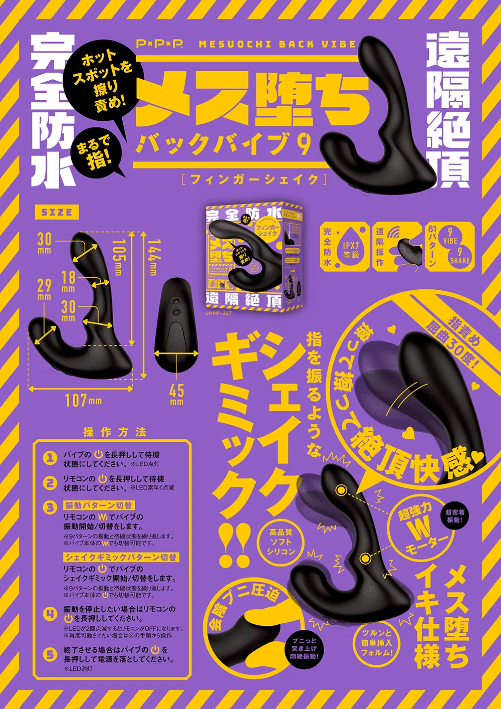 超频率抠震前列腺与震动会阴刺激让您彻底坠落,化身为女性的新境界!以30度角弯曲的抠震刺激,让您如女性般高潮的振动棒! ① 9种抠动机关模式搭配9种震动模式玩法多多! ② 双W马达震动刺激前列腺和会阴双重享受! ③ 遥控操作,方便容易,自己玩一起玩随心所欲! ④ IPX7 等级完全防水,可以水洗更容易清洁! ⑤ 日本产原装进口质量保证,可放心使用! 色色情趣用品商城现今隆重推出完全防水系列产品「P×P×P 完全防水 – 遥控极限 雌堕后庭 雌堕后庭振动棒9 指震[前列腺会阴双重快感]」,欢迎您的选购!性玩具能增加情侣间的亲密感,让你的夜晚更加刺激和多采多姿。这一款可以同时刺激前列腺和会阴的后庭振动棒,以30度角弯曲的手指抠动机关摩擦敏感部位带来高潮快感!放置在两处的超强双马达,以超频密的震动和会阴刺激震动来强烈追击您!优质柔软的矽胶Q弹的插入带来压迫惑,是非常舒服Q弹地压迫会阴部的构造。使用触感光滑温和的优质柔软矽胶,易于插入的形状。像被真人手指抠抠一样令您目眩粗喘气,感受升天般的快感!马上拥有这款让您可以像女生一样高潮的前立腺高潮设计的优秀振动棒,发挥创意,配合 「久兴 缓痛舒适型后庭润滑油」,马上开启一场有情有趣的真正游戏吧!为了提供更好的亲密体验,我们的店铺提供了一系列高品质的按摩棒。 ■ 包装尺寸(mm):H150 × W120 × D50